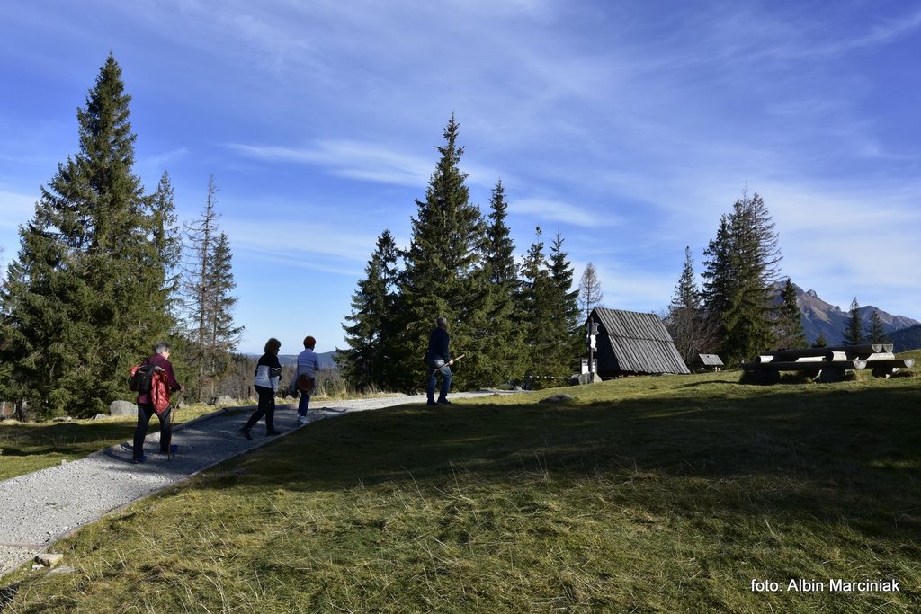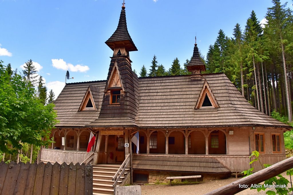 Sanktuarium Matki Bożej Jaworzyńskiej Królowej Tatr na Polanie Wiktorówki. Drewniany kościółek znajduje się kilkaset metrów od Rusinowej Polany.