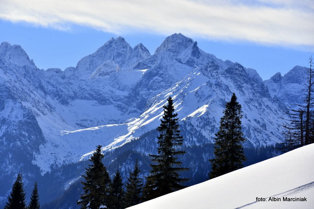 Rusinowa Polana w zimowej scenerii z widokiem na Tatry Wysokie.