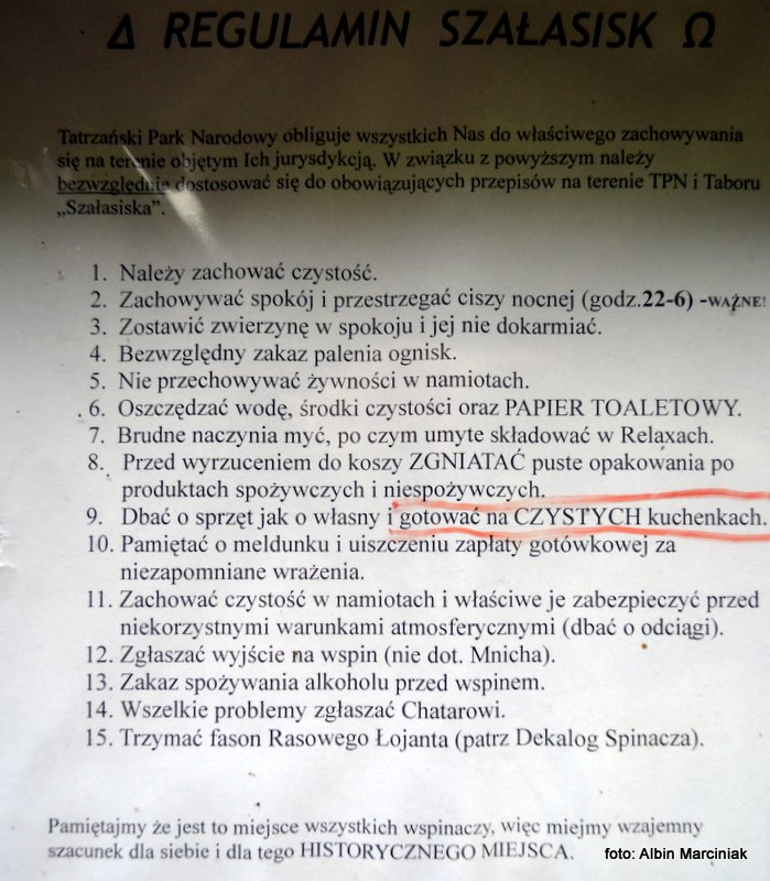 Osobom nocującym zapewniane są: miejsce w namiotach na materacach, możliwość korzystania z kuchni turystycznej (kuchenki gazowe) oraz skromne zaplecze sanitarne. Oczekujemy traktowania bazy tatrzańskiej jako naszego wspólnego dobra, za które razem odpowiadamy jako jedno środowisko. Każde obozowisko ma swój wewnętrzny regulamin, którego ostateczna interpretacja należy do kierownika taboru. Obozowiska leżą na terenie Tatrzańskiego Parku Narodowego i obowiązują na nich przepisy ochrony przyrody dotyczące parków narodowych oraz zarządzenia TPN.