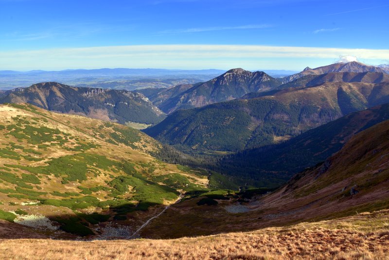 Widok na Wysokie Tatry po stronie Słowackiej, ze szlaku prowadzącego z Wierchu Porońca na Rusinową Polanę.