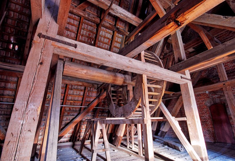 Jednym z takich miejsc są poddasza Zamku Wysokiego, z gotycką windą w kształcie koła. Urządzenie wyciągowe napędzane było przez czterech rosłych mężczyzn, w sposób podobny jak robią to chomiki. Mechanizmem jest koło deptakowe o średnicy około czterech metrów. Jako siłę napędową wykorzystywano ludzi stąpających wewnątrz tego bębna. Urządzenie było w stanie podnieść ciężar kilkuset kilogramów na wysokość wielu metrów. Łacińska nazwa dźwigu - caranum.