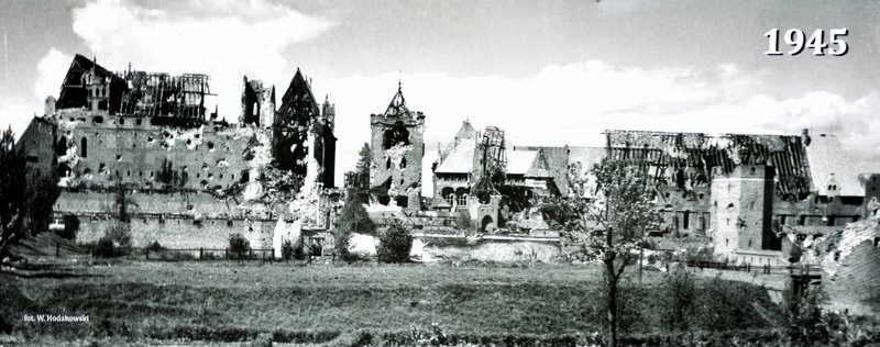 Zamek bardzo mocno ucierpiał w trakcie działań wojennych w 1945 roku. W wyniku ciężkich walk Grupy Bojowej Marienburg z jednostkami 2 rosyjskiej Armii Uderzeniowej, zniszczeniu uległo blisko 80 procent zabudowy Starego Miasta Malborka. Poważnie uszkodzone też zostały wschodnie partie zespołu zamkowego – prezbiterium kościoła Najświętszej Marii Panny z mozaikową figurą Marii z Dzieciątkiem, wieża główna, skrzydło wschodnie Zamku Średniego, zabudowa Przedzamcza. 8 marca wycofujące się oddziały niemieckie wysadziły w powietrze mosty na Nogacie.