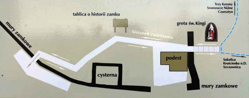 Ruiny Zamku Pienińskiego to atrakcja bezpłatna, można je zwiedzać za darmo. W dobrym stanie zachował się mur obronny o grubości dochodzącej do 180 centymetrów, fragmenty zabudowań oraz ocembrowana cysterna służąca do przechowywania wody. Drewniane konstrukcje twierdzy nie przetrwały natomiast próby czasu. Tuż obok pozostałości warowni znajduje się Grota Świętej Kingi, w której umieszczono figurę władczyni. Uroczyste poświęcenie jaskini miało miejsce podczas nabożeństwa w 1904 roku.