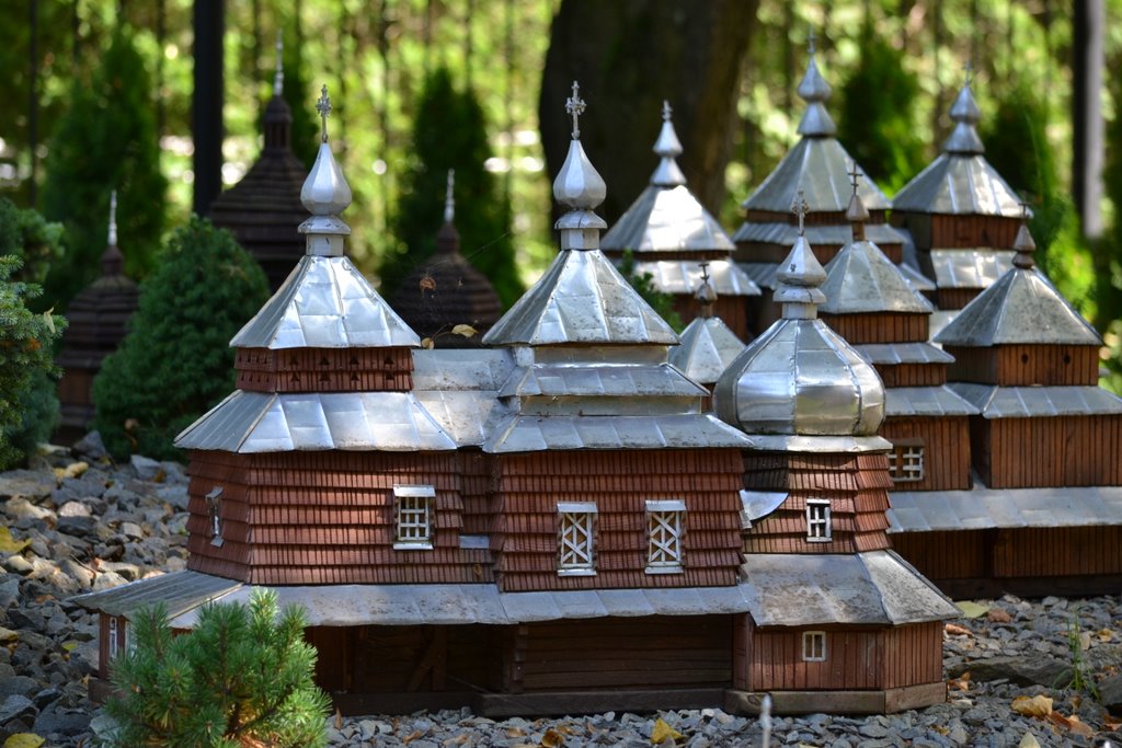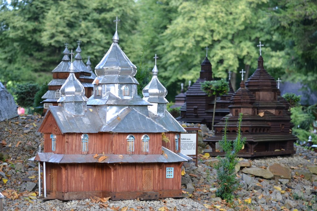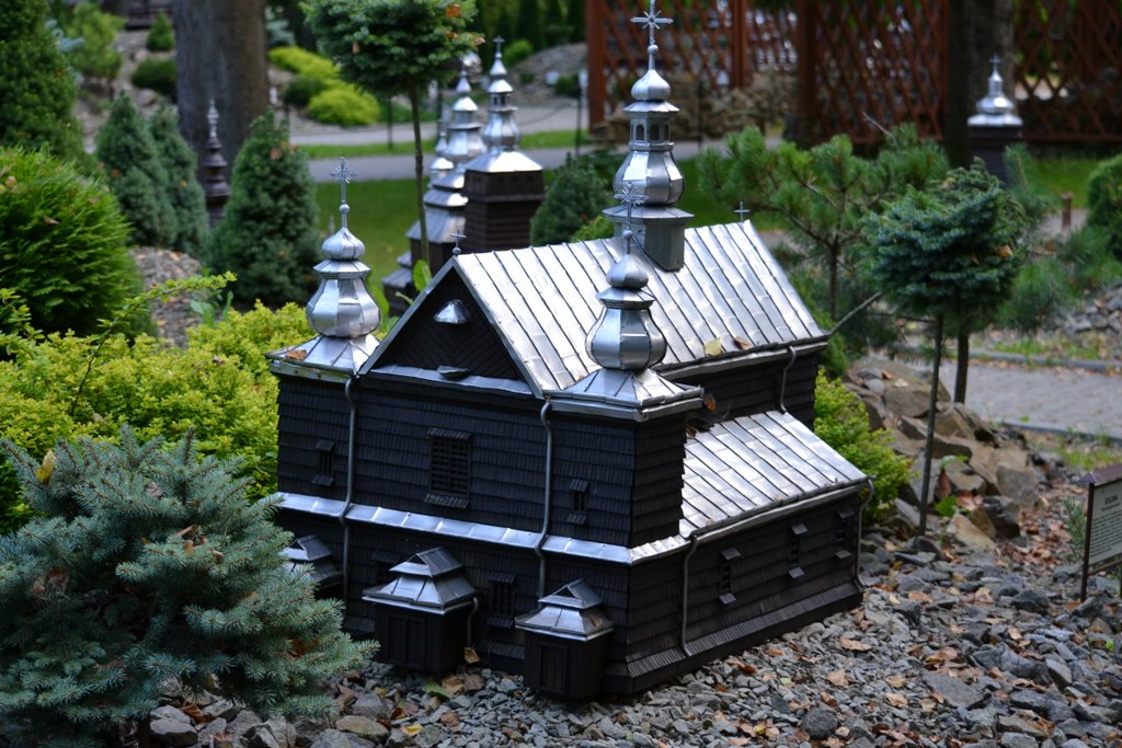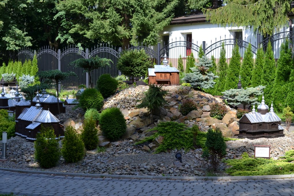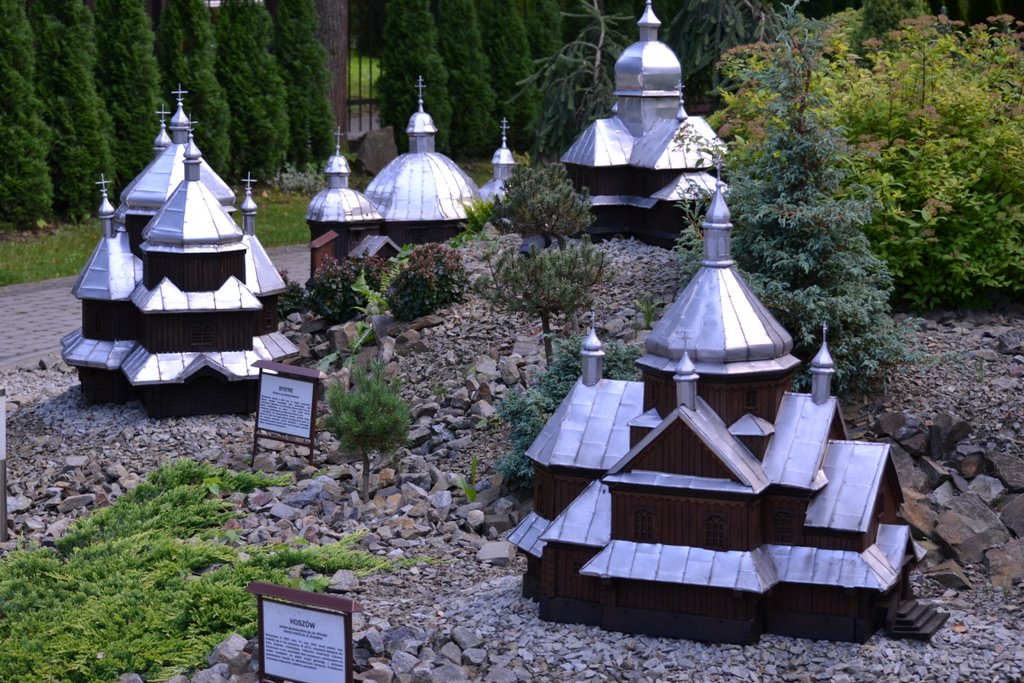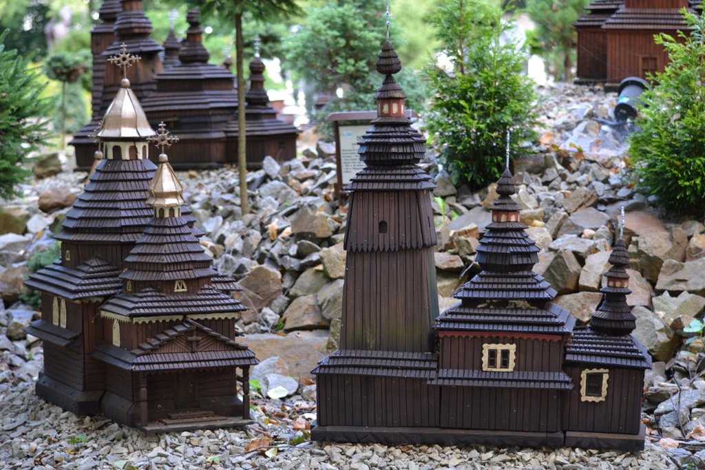 Na obszarze ok. 0,8 ha, na 10 wzgórzach, zostało ustawionych 140 makiet w skali 1 : 25 najstarszych drewnianych kościołów rzymsko - katolickich, cerkwi prawosławnych, greckokatolickich, z terenu południowo – wschodniej Polski, Słowacji i Ukrainy.