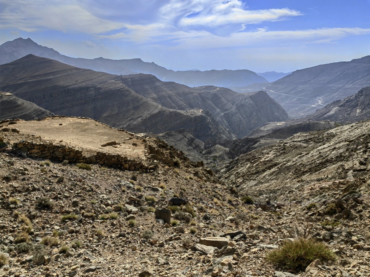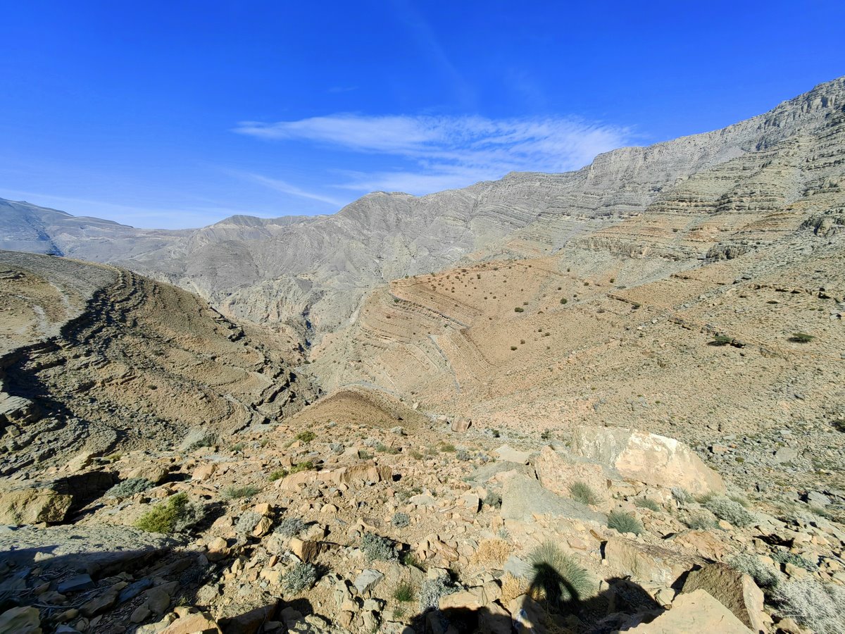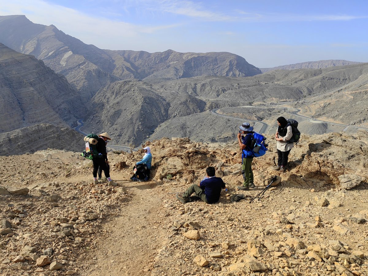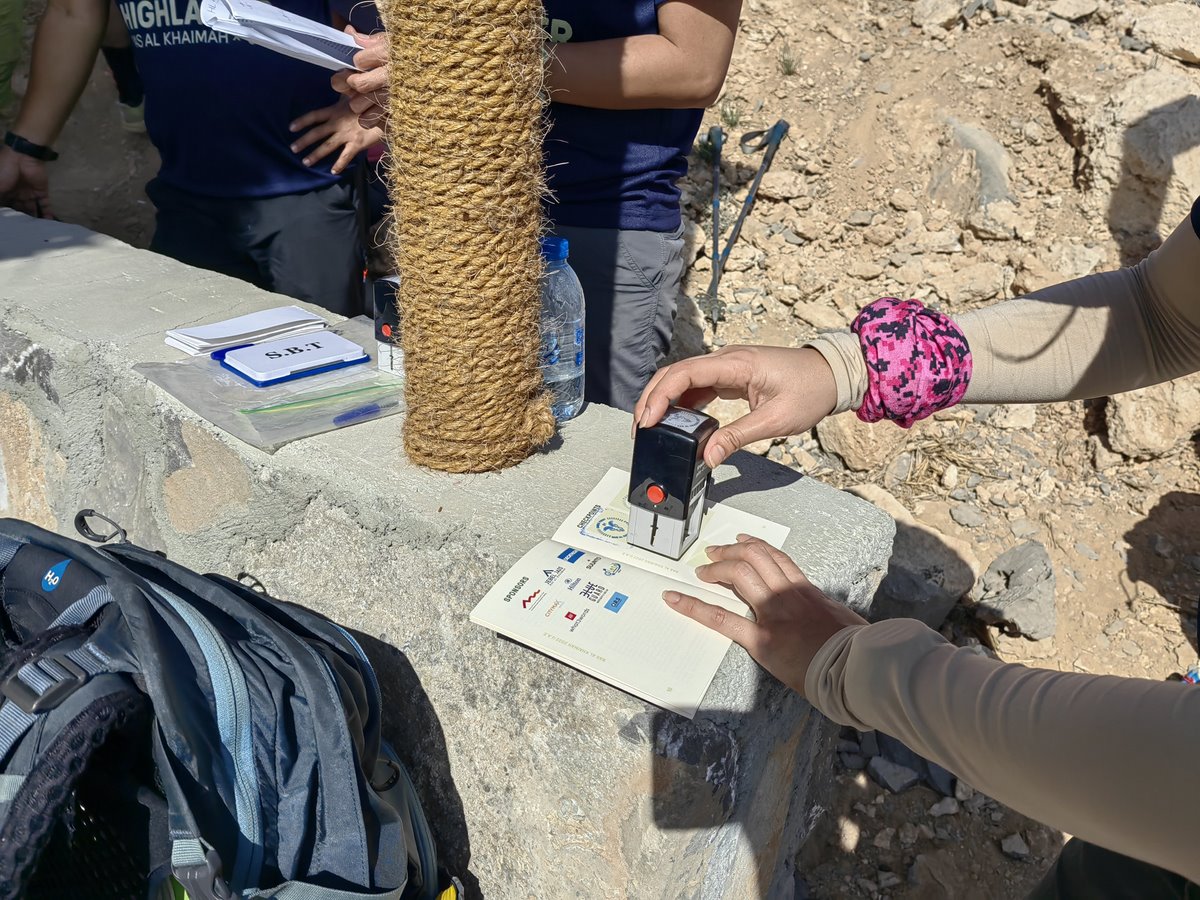 Daleko nad nami widać wierzchołek Jebel Jais czyli najwyższej góry w Zjednoczonych Emiratach Arabskich. Tam także zaplanowany jest nasz pierwszy biwak i nocleg. Szlak którego nie widać, wije się pomiędzy skałami i warstwami rumoszu, przecinając urwiste zbocza grzbietu górskiego. Przede mną kilkugodzinna mozolna wędrówka przerywana postojami na odpoczynek i picie. Na jedzenie w tych warunkach nie mam absolutnie najmniejszej ochoty. słońce jest bezlitosne i mimo połowy listopada, temperatura sięga +32 stopni w cieniu a w słońcu jest nie do wytrzymania. Dookoła tylko skały. Krok za krokiem i tak mijają kolejne godziny. W końcu dochodzę do miejsca gdzie zbocze pokryte różnej wielkości skałami kończy się kilkaset metrów wyżej betonowym murkiem zakrętu drogi. Wysoko nade mną na skale widzę jakąś postać. Czuję ulgę bo to znak że jestem już prawie u celu. Celu dzisiejszego odcinka. Kolejne kroki i minuty podejścia resztkami sił i wreszcie słyszę okrzyki i oklaski. Tak witani byli wszyscy dochodzący do kolejnych punktów. Mam też drugą pieczątkę jaka jest konieczna do potwierdzenia przejścia całej trasy.