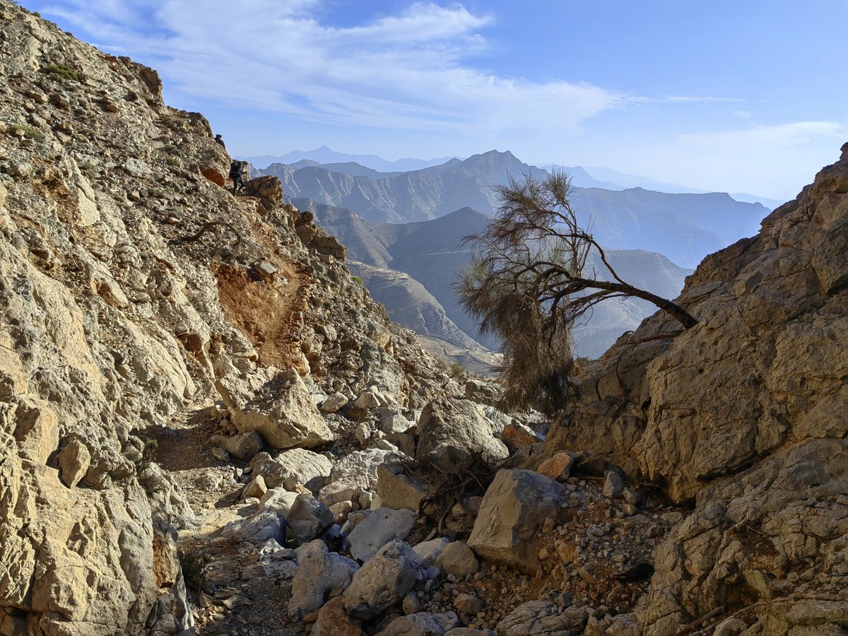 Skoro ruszałem z najwyższego punktu na całej trasie, wydawało mi się że dzisiejszy szlak prowadzi tylko w dół. Miałem rację, wydawało mi się ale o tym przekonałem się w w trakcie dnia. Nie powiem, początek marszu był bardzo przyjemny bo schodząc góry szlak prowadził grzbietem masywu a to pozwalało podziwiać zarówno potężny masyw górski z częścią Omanu po lewej, jaki i Zatokę Perską po prawej. Mijałem także miejsce które już znałem sprzed kilku dni oraz sprzed roku, gdzie miałem przyjemność zjechać na najdłuższej tyrolce na świecie (dwukrotnie) zjechałem nowo wybudowanym torem saneczkowym Jais Sledder oraz zjadłem pyszny obiad w najwyżej położonej restauracji w ZEA, 1484 by Puro która działa od niespełna roku. To było a teraz mijałem te miejsca ze świadomością, że zamiast zjazdów ma marsz a zamiast wykwintnego obiadu mam czystą wodę i batony energetyczne. No cóż, sam chciałem. Kilka zdjęć, spojrzenie na miejsce tętniące życiem i ruszam dalej. Po drodze zdobyłem kolejny szczyt, przygotowany dla lokalsów niczym nasz Kasprowy. Kilkaset metrów poniżej była oczywiście restauracja a nieco dalej na murku kilka butli z wodą. Zdziwiło mnie to nieco, bo woda ustawiona była ewidentnie pod uczestników Highlandera czyli naszej imprezy. Niezbyt zainteresowany przeszedłem obok, nieświadomy swojego błędu.