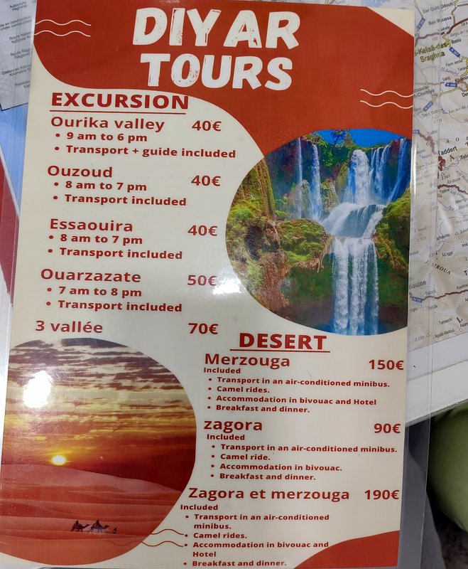 Ofert lokalnych biur, oferujących wyjazdy do najpopularniejszych miejsc poza miastem jest wiele. Ceny za te same wycieczki są bardzo zbliżone, ale jak to w Maroko, warto się targować. Nam udało się wynegocjować cenę za dwudniową wycieczkę w góry z noclegiem na pustyni, wieczornym ogniskiem z poczęstunkiem oraz skromnym śniadaniem - 70 euro za osobę. Jako że kolejną wycieczkę także rezerwowaliśmy w tej samej firmie, całodzienna wycieczka (3,5 h jazdy w jedną stronę) do wodospadów Uzud, płaciliśmy po 30 euro za osobę. Ustalając cenę warto uzgodnić wcześniej i ew. niewiele dopłacić, by transport był wraz z transferem z waszego hotelu i podobnie powrót. To znacznie ułatwia poranne szukanie właściwego miejsca, oraz busa jakim macie jechać na wycieczkę. Jak wygląda trzeci co do wysokości wodospad w Afryce, odsyłam do reportażu w linku poniżej.