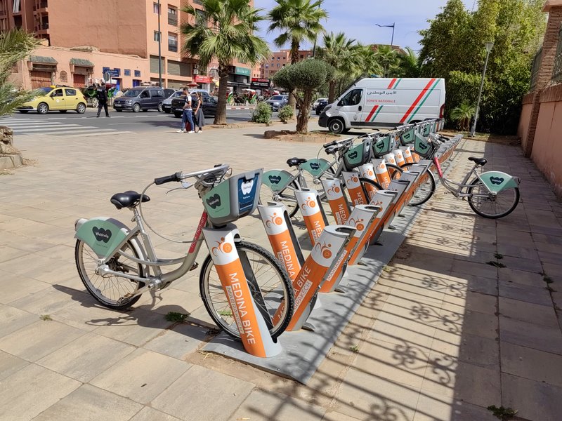 W Marrakeszu działa wypożyczalnia rowerów miejskich. Na takie stojaki natrafiłem przy ogrodach Jardin Majorelle i muzeum kultury berberyjskiej.