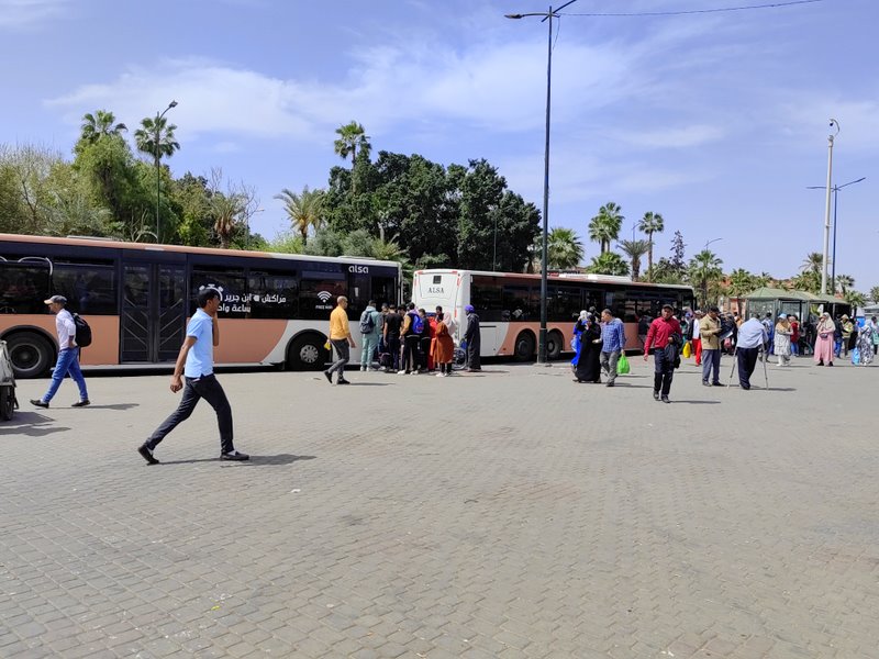 Tuż obok murów otaczających zabytkowe centrum Marrakeszu, na zamkniętym placu jest dworzec autobusowy (bilety w kasie dworca lub przez aplikacje danych przewoźników). Obok dworca ale już przy głównej ulicy jest przystanek autobusów i busów lokalnych oraz komunikacji miejskiej (numerowane linie na konkretnych kierunkach). Bilety kupuje się u kierowcy.