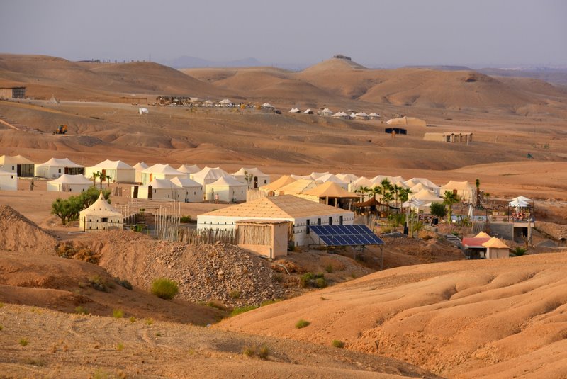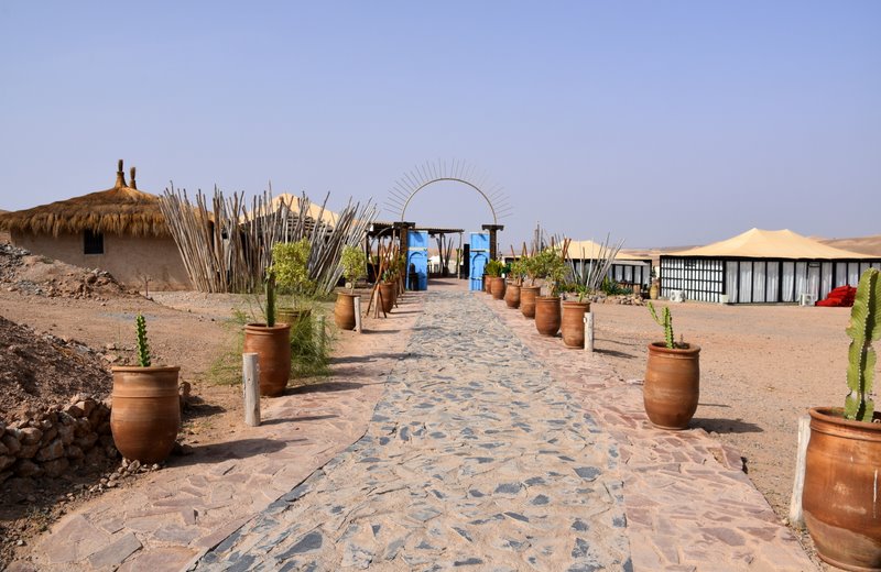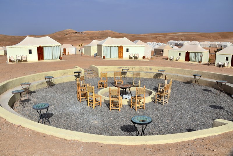 Obóz jakich wiele w tej części pustyni Agafay, znajduje się mniej więcej w połowie drogi z Marrakeszu w góry Atlasu Wysokiego. Odległość ok 30 km jest więc na tyle niewielka, by można było sobie pozwolić na jednodniowy wypad z Marrakeszu. To także całkiem ciekawa opcja dla wyruszających lub powracających z wyprawy na Tobkal, będącego najwyższym szczytem gór Atlasu, a dla wielu osób z całego świata, głównym celem wizyty w Maroko. Z obozu do samego szczytu w linii prostej jest zaledwie 50 km, więc przy dobrej pogodzie widać nie tylko masyw górski ale i wierzchołek Tubkala. Za masywem Atlasu zaczyna się wielka Sahara, największa pustynia na naszym globie.