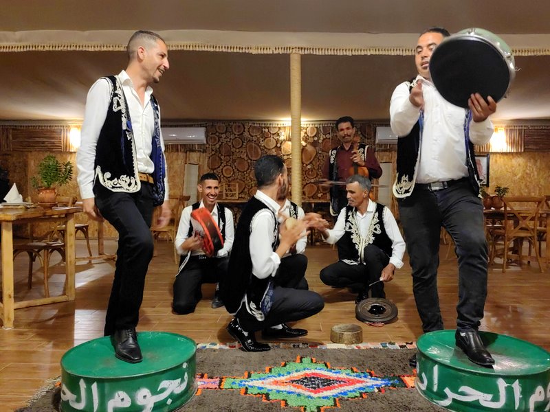 Wieczory to oczywiście Gnaoua, Marokański Folklor, Dekka Mrakchia. Wszystkie atrakcje odbywają się zawsze podczas kolacji. Jest także ognisko i kolejna porcja występów a na finał pokaz ogniomistrzów. To zawsze robi wrażenie i jest miłym akcentem na koniec dnia. Koniec aktywności programowych ale niekoniecznie koniec dnia, no bo jak iść spać w takich okolicznościach przyrody? Nie co dzień sypiam na pustyni, toteż nie oddałem się objęciom Morfeusza po ostatnich dźwiękach muzyki Tuaregów. Nad basenem życie toczy się praktycznie do rana.