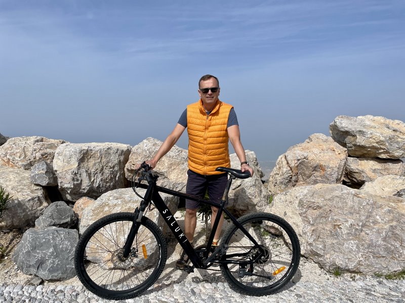 Jeżeli chcemy zasmakować jazdy rowerem górskim po górach Ras Al Khaimah to najlepiej skierować się do miejsca nazwanego „Viewing Deck Park”, które jest kilkupoziomowym tarasem widokowym przy głównej drodze prowadzącej pod szczyt Jebel Jais. Po jednej stronie mamy wybetonowane ścieżki i kamienne podesty widokowe, a z drugiej strony są ulokowane parkingi. To tam możemy wypożyczyć jednoślad (30AED za godzinę), a do wyboru jest 8 rowerów elektrycznych. I od razu dwa zaskoczenia. Jednoślady są marki „Saluki”, która jest rodzimym produktem Zjednoczonych Emiratów Arabskich.