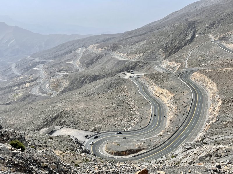 Z parkingu mamy 4300m jazdy pod górę. Jedziemy serpentynami wzdłuż głównej drogi po szerokim (ok.1,5m) wydzielonym, oznaczonym pasie dla pieszych i rowerzystów. Po drodze mijamy kilka punktów widokowych, a naszym celem jest zlokalizowana na wysokości 1484m restauracja „Puro”. To najwyżej w Emiratach Arabskich położona restauracja oferująca danie arabskie i międzynarodowe, zarówno wewnątrz, jak i na panoramicznym tarasie. Warto podkreślić, że po jej lewej stronie jest górna stacje najdłuższej tyrolki na świecie (2831m), a po prawej punkt startu toru saneczkowego.