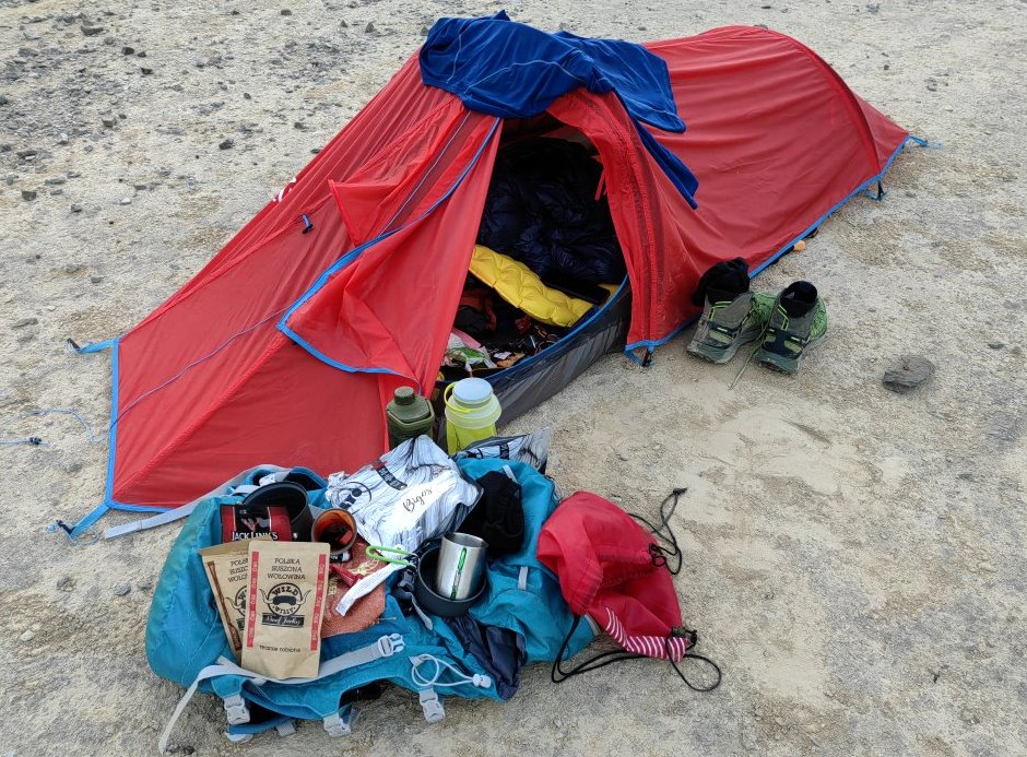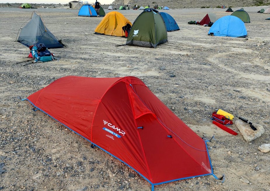 Z wyborem namiotu miałem twardy orzech do zgryzienia. Przez blisko dwa miesiące poszukiwałem idealnego rozwiązania. Byłem bliski zakupu Naturehike Vik 1 15D o wadze 1110 gram. Jednak wymiary spakowaniu: 46×16 cm trochę zniechęcały. Taki rozmiar zajmuje jednak dużo miejsca w plecaku. Praktycznie na kilka dni przed wylotem mój wybór padł na ultralight i ultra kompaktowy namiot Camp Minima Sl I. Jeden z najmniejszych i najlżejszych namiotów na świecie. Idealny dla górskich solistów. Waga tylko 0,96 kg a wymiary po złożeniu: 29 x 12 cm.