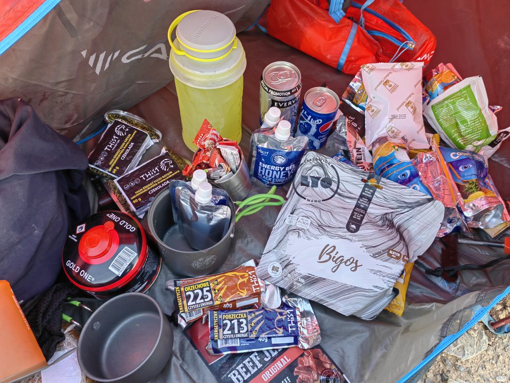 Woda to podstawa czy to do picia czy też do gotowania. Zgrzewka wody w jednorazowych butelkach plastykowych odpada. Używam butelek wielorazowego użytku a składana butelka o pojemności 1 L jest niezastąpiona. Żele i batony energetyczne na dłuższych trasach bywają bardzo pomocne i dają chwilowego kopa. Ja dałem się przekonać i nie żałuję, do firmy ze Śląska produkującej pod markąTHiS1. Czekolada, z guaraną czy czarna porzeczka, smakują, dają efekt a co istotne, w upałach nie roztapiają się a przy mrozach nie stają się kamieniem do kruszenia czekanem. Czasami zabieram także suszoną wołowinę. Lekkie i pożywne a do tego całkiem smaczne.