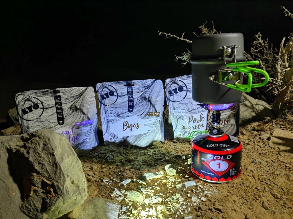 Jedzenie jako podstawę zawsze wybieram LYO food. Mam pewność że mi będzie smakować a polskim bigosem wywołałem spore poruszenie w górach ZEA pośród wielu uczestników marszu z całego świata. Lubię doprawione więc w małych woreczkach strunowych mam zazwyczaj trochę soli i pieprzu. Kawa 3 w 1 załatwia temat od lat.
