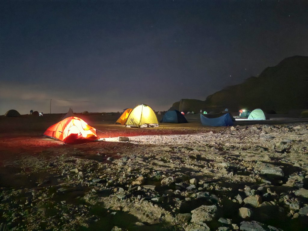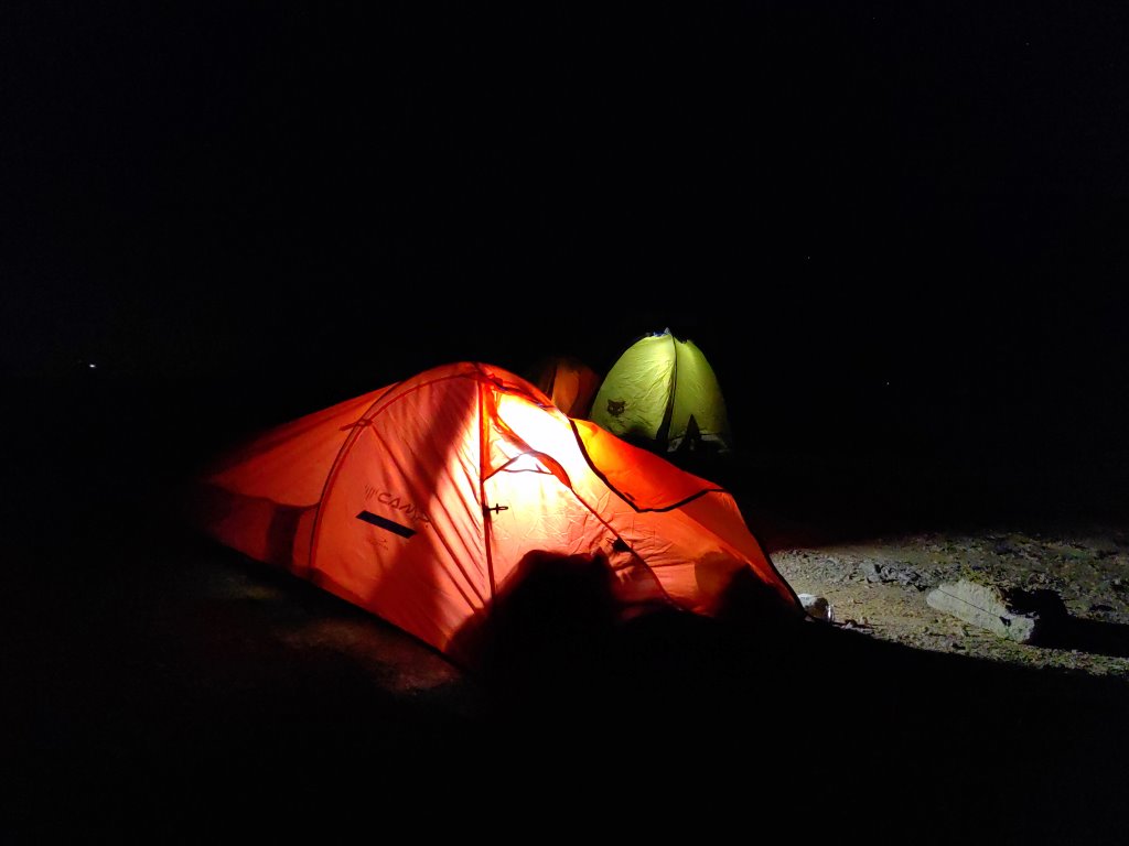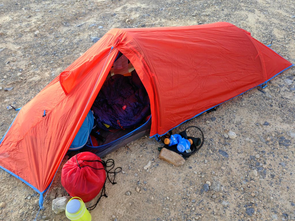 Pierwsze rozbicie namiotu miało miejsce na biwaku na najwyższej górze Al-Hadżar w Zjednoczonych Emiratach Arabskich. Pierwsze, bez wcześniejszych prób w domu i od razu przy niezłym wietrze. Do tego na twardym gruncie bez możliwości wbicia szpilek. Na rozbicie pozwoliła ciekawa konstrukcja z dwoma poprzecznymi łukowymi pałąkami i linkami - odciągami, które zablokowałem kamieniami. Druga noc i biwak na innym podłożu, gdzie już mogłem bez problemów wbijać szpilki.